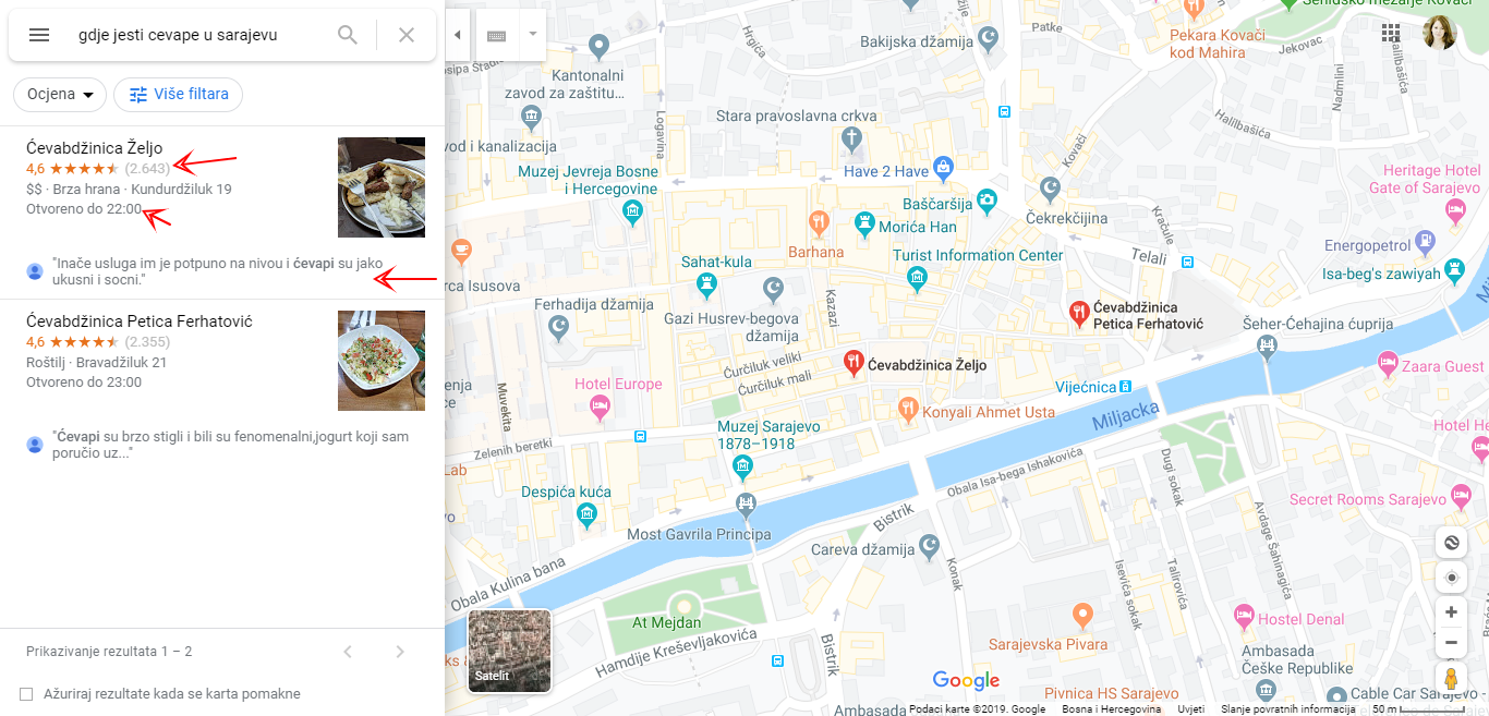 Pogledajte vrlo jednostavan primjer. Za pitanje “gdje jesti ćevape u Sarajevu” rezultat je ovakav.